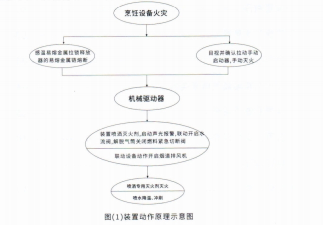 本装置主要由箱体,控制盘、灭火剂贮存容器、驱动气体贮存容器、水流阀、燃料紧急切断阀、机械驱动器、减压器、单向阀、连接管、解脱气筒、喷嘴、手启动盒、感温易熔金属拉索释放器、轴承角轮、管路、管件等部件组成。